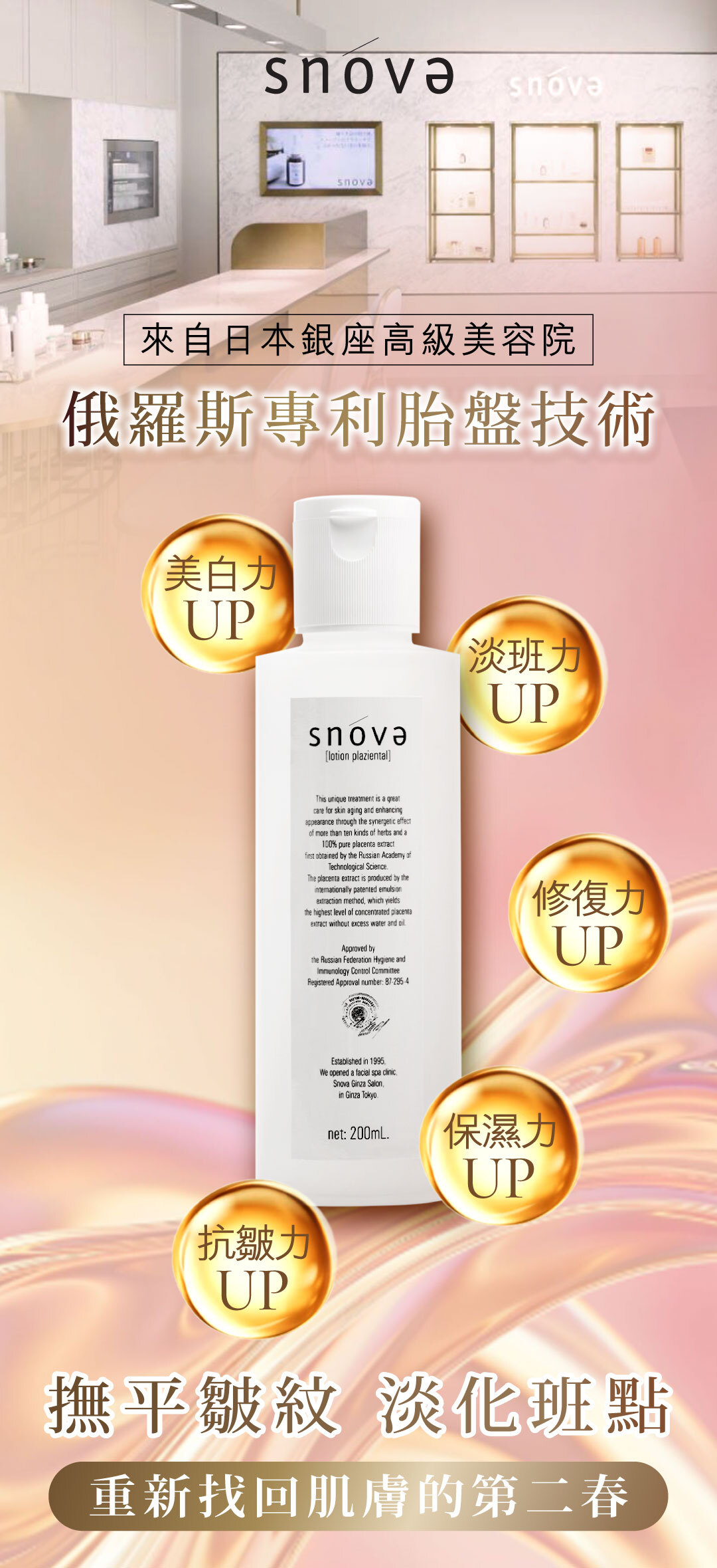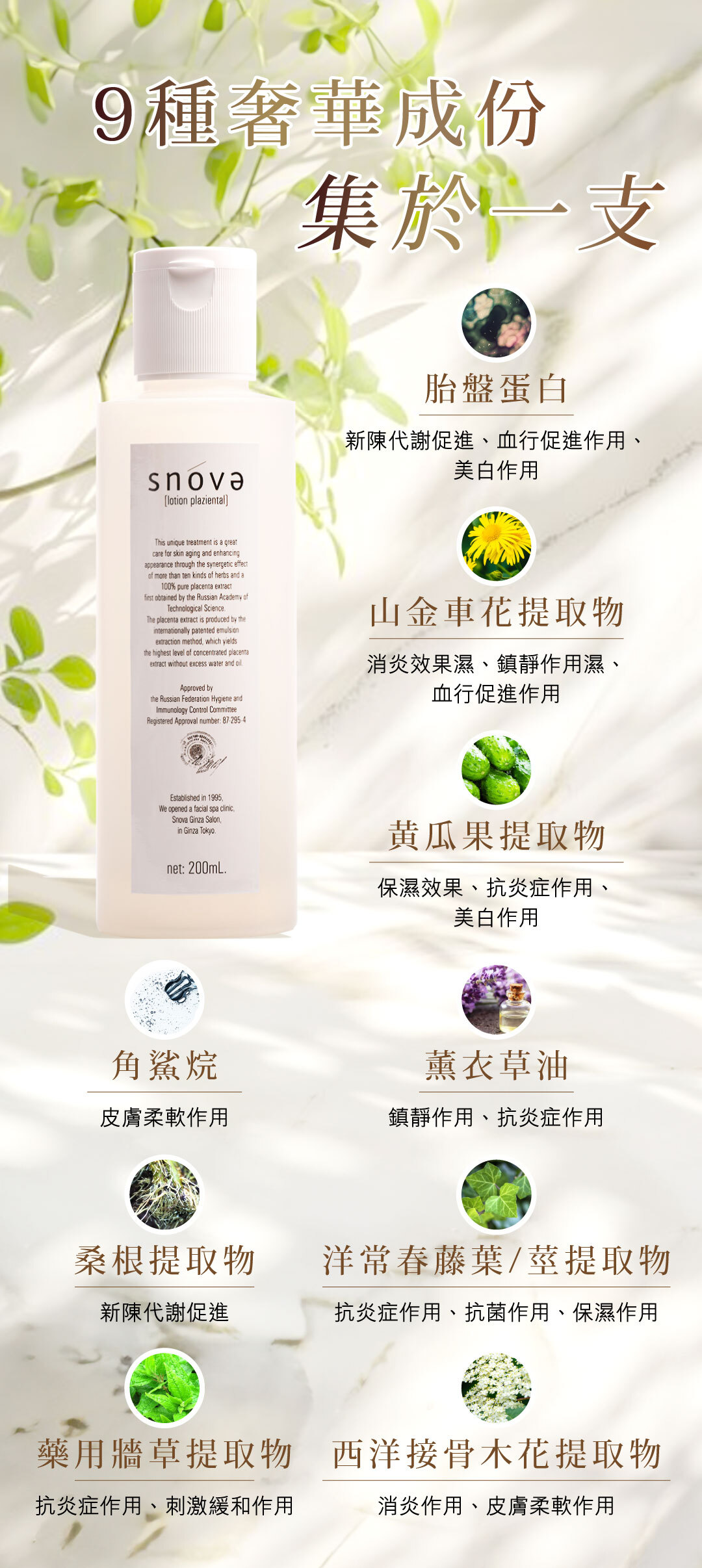 源自日本銀座高端美容沙龍品牌的Snova,獨家採用俄羅斯專利技術萃取的100%純淨「KURASA胎盤素原液」,融合多種珍貴草本精華,打造這款多機能保濕乳液。輕盈不黏膩的質地,專為追求簡約高效保養的你而生——僅需化妝水後一抹,即可全面呵護肌膚,帶來柔軟、水潤與自然光澤。