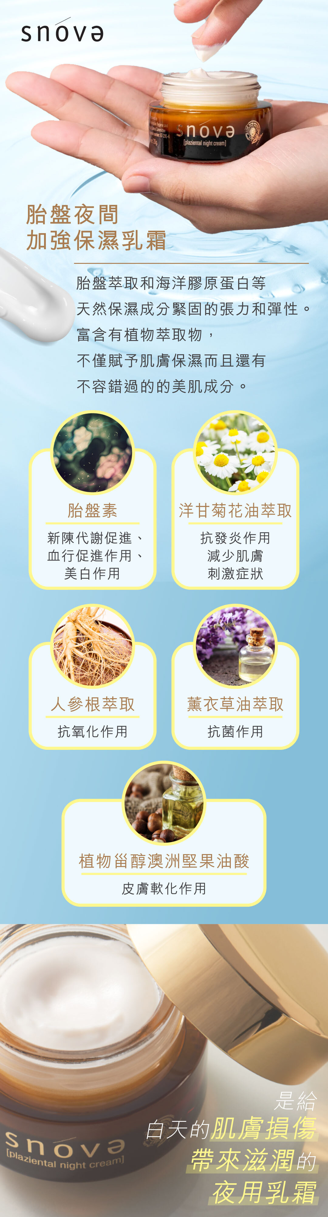 自從問世以來,「胎盤夜間加強保濕乳霜」便憑藉卓越功效與尖端科技支援,獲得眾多使用者的高度好評,成為備受矚目的夜間護膚秘密武器。夜晚使用時,乳霜質地濃潤、觸感飽滿,塗抹在肌膚上即刻感受水潤包覆。隔天醒來,您會驚喜發現肌膚變得柔嫩細緻,輪廓線條看起來更加緊緻上揚。